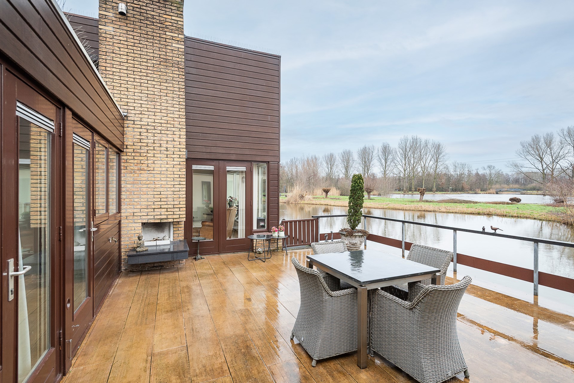 De grote en lichte woonkamer met (gas) openhaard is gelegen aan de achterzijde en biedt een prachtig vrij uitzicht over het water en natuurgebied Hitland. Openslaande deuren geven toegang tot het zonneterras, gelegen op het noordoosten.