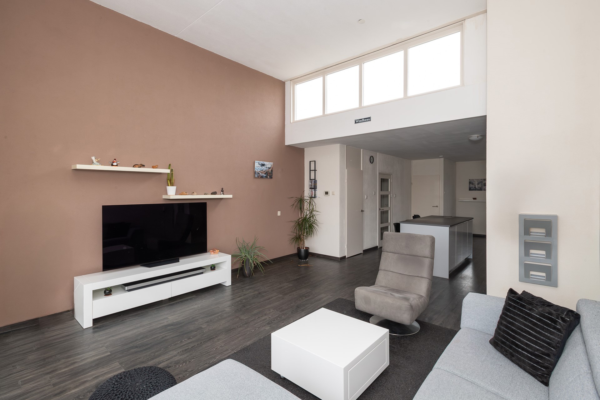 Op de verdieping bevindt zich de royale woonruimte. Het plafond in het zitgedeelte is maar liefst 4.4 meter hoog wat een bijzonder ruimtelijk gevoel geeft. Dankzij de grote en vele raampartijen geniet de woonkamer van een aangename hoeveelheid daglicht. De open keuken met bar vormt het centrale punt van de ruimte en biedt volop werk- en opbergruimte. De keuken is voorzien van inbouwapparatuur zoals een vaatwasser, koelkast, combi-oven, 5-pits gaskookplaat en afzuigkap. De woonkamer beschikt tevens over een wasruimte voorzien van de witgoedaansluiting en Remeha C.V.-ketel 2009. Op de woonverdieping is eventueel nog ruimte om een tweede slaapkamer te creëren.