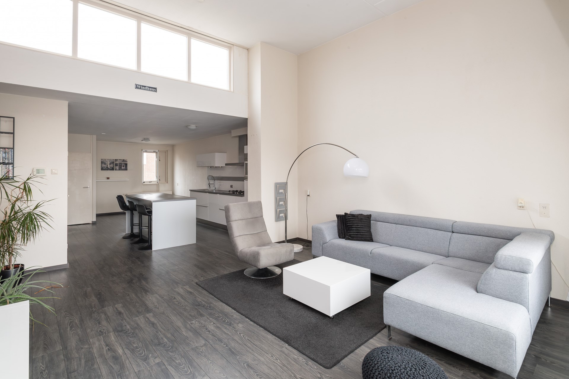 Op de verdieping bevindt zich de royale woonruimte. Het plafond in het zitgedeelte is maar liefst 4.4 meter hoog wat een bijzonder ruimtelijk gevoel geeft. Dankzij de grote en vele raampartijen geniet de woonkamer van een aangename hoeveelheid daglicht. De open keuken met bar vormt het centrale punt van de ruimte en biedt volop werk- en opbergruimte. De keuken is voorzien van inbouwapparatuur zoals een vaatwasser, koelkast, combi-oven, 5-pits gaskookplaat en afzuigkap. De woonkamer beschikt tevens over een wasruimte voorzien van de witgoedaansluiting en Remeha C.V.-ketel 2009. Op de woonverdieping is eventueel nog ruimte om een tweede slaapkamer te creëren.