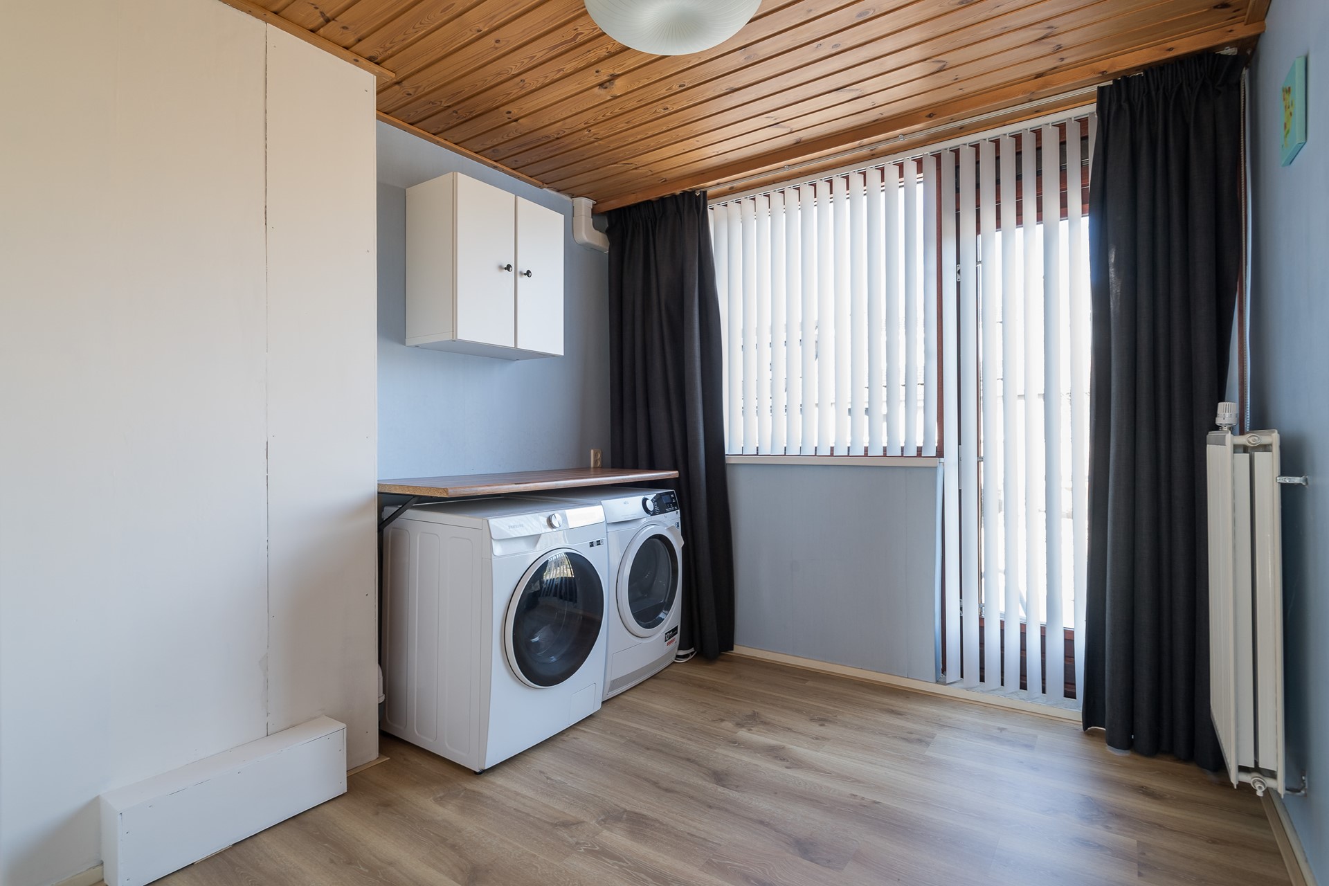 Via de entree kom je in de hal met meterkast en een modern betegeld toilet. De keuken in praktische U-opstelling is voorzien van inbouwapparatuur en biedt voldoende werk- en bergruimte. De royale, lichte woonkamer van ruim 30 m² en maar liefst 6,5 meter breed is een heerlijke plek voor het hele gezin. Dankzij de PVC vloer met vloerverwarming geniet je hier van extra comfort.