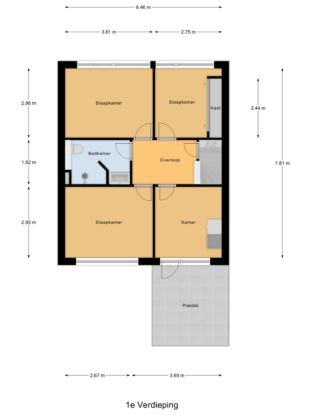 Hier bevinden zich vier ruime slaapkamers, perfect als kinder-, werk- of hobbykamer. De volledig betegelde badkamer is praktisch ingericht met een douche, toilet en wastafelmeubel.