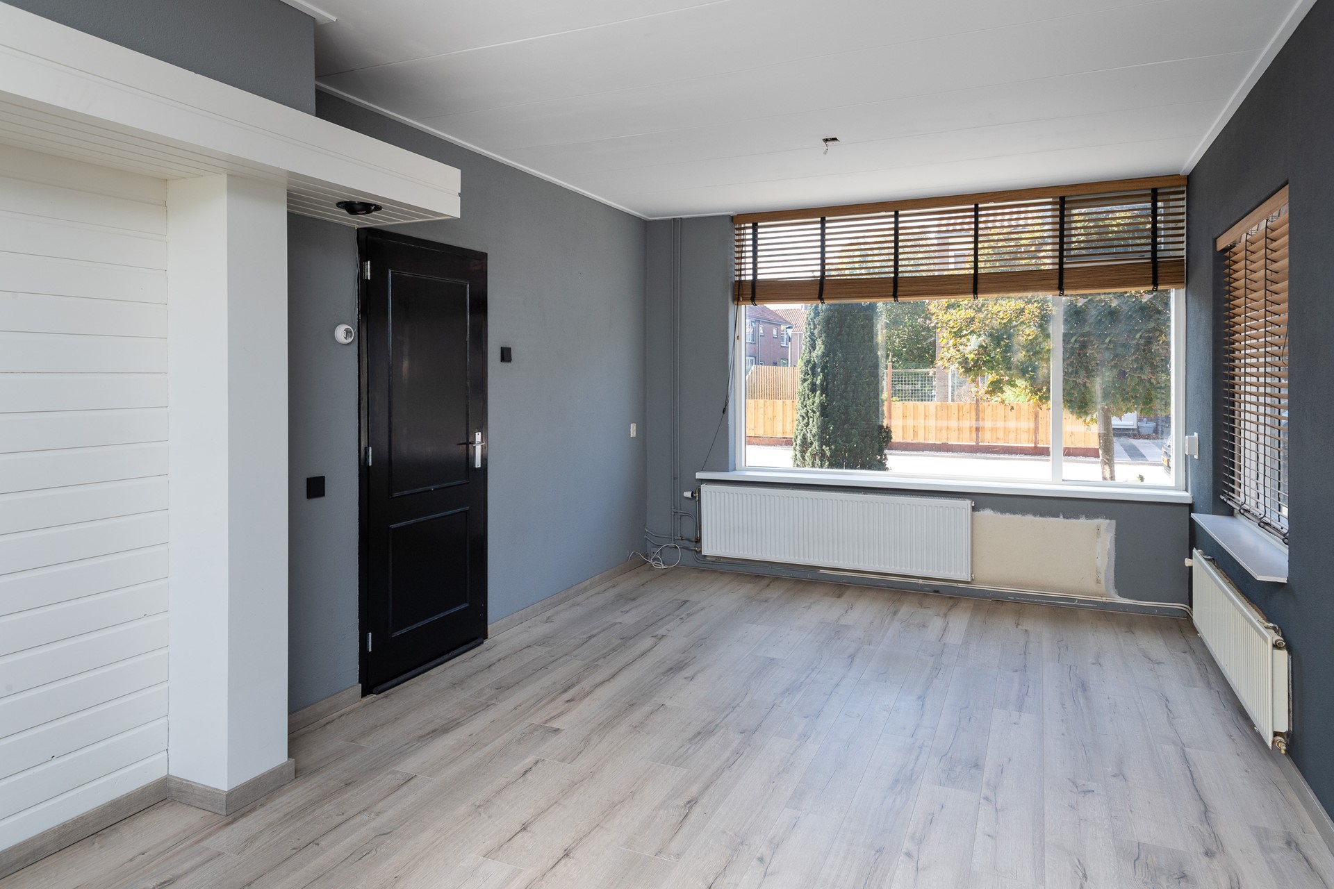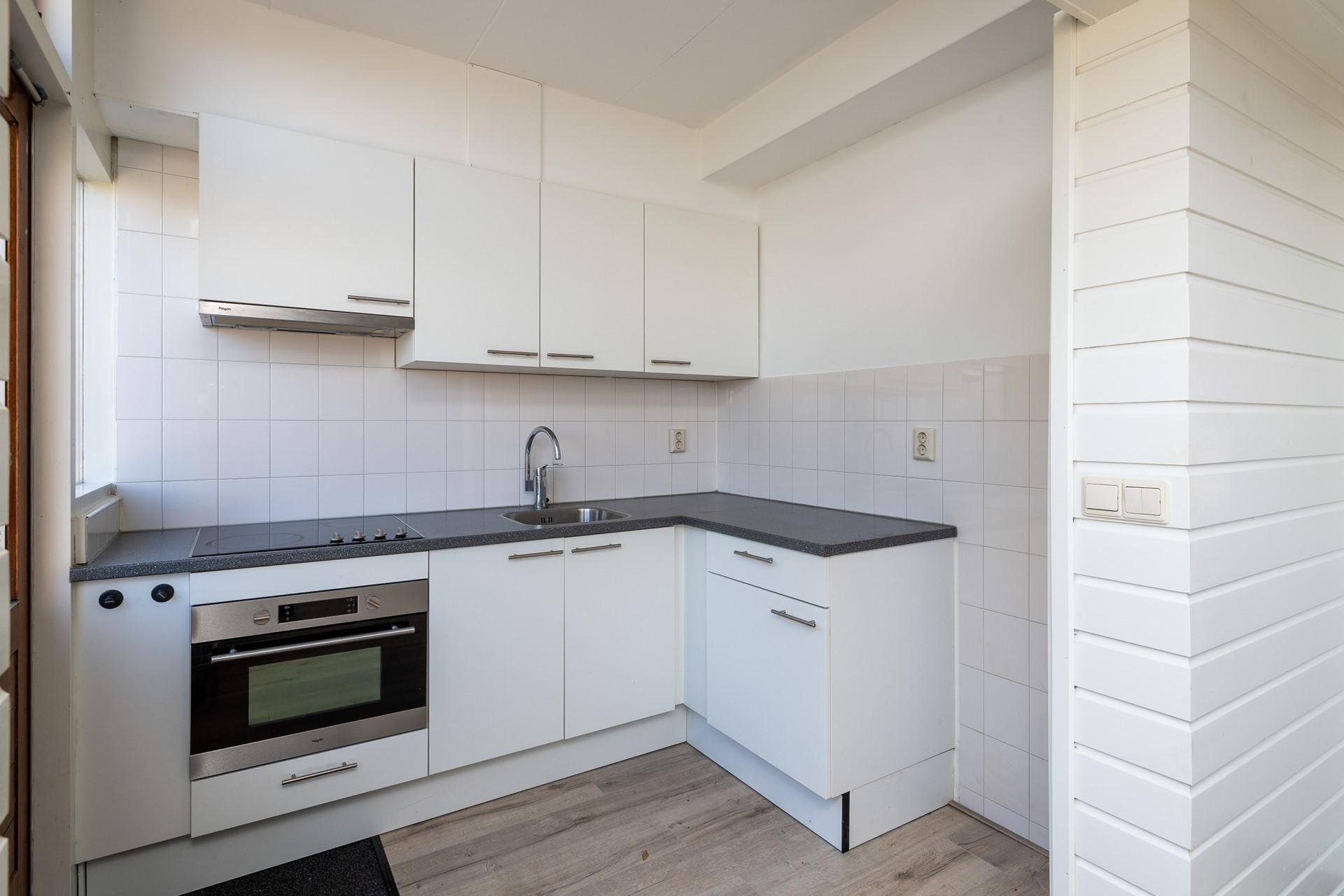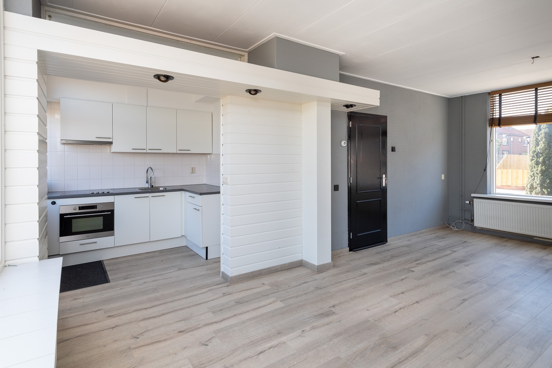 Entree, hal met trapopgang, modern hangend toilet en kelderkast. Lichte doorzonkamer van circa 6.45 x 3.50m met laminaat vloer. Moderne halfopen keuken van circa 2.35 x 2.00m met keramische kookplaat en oven.