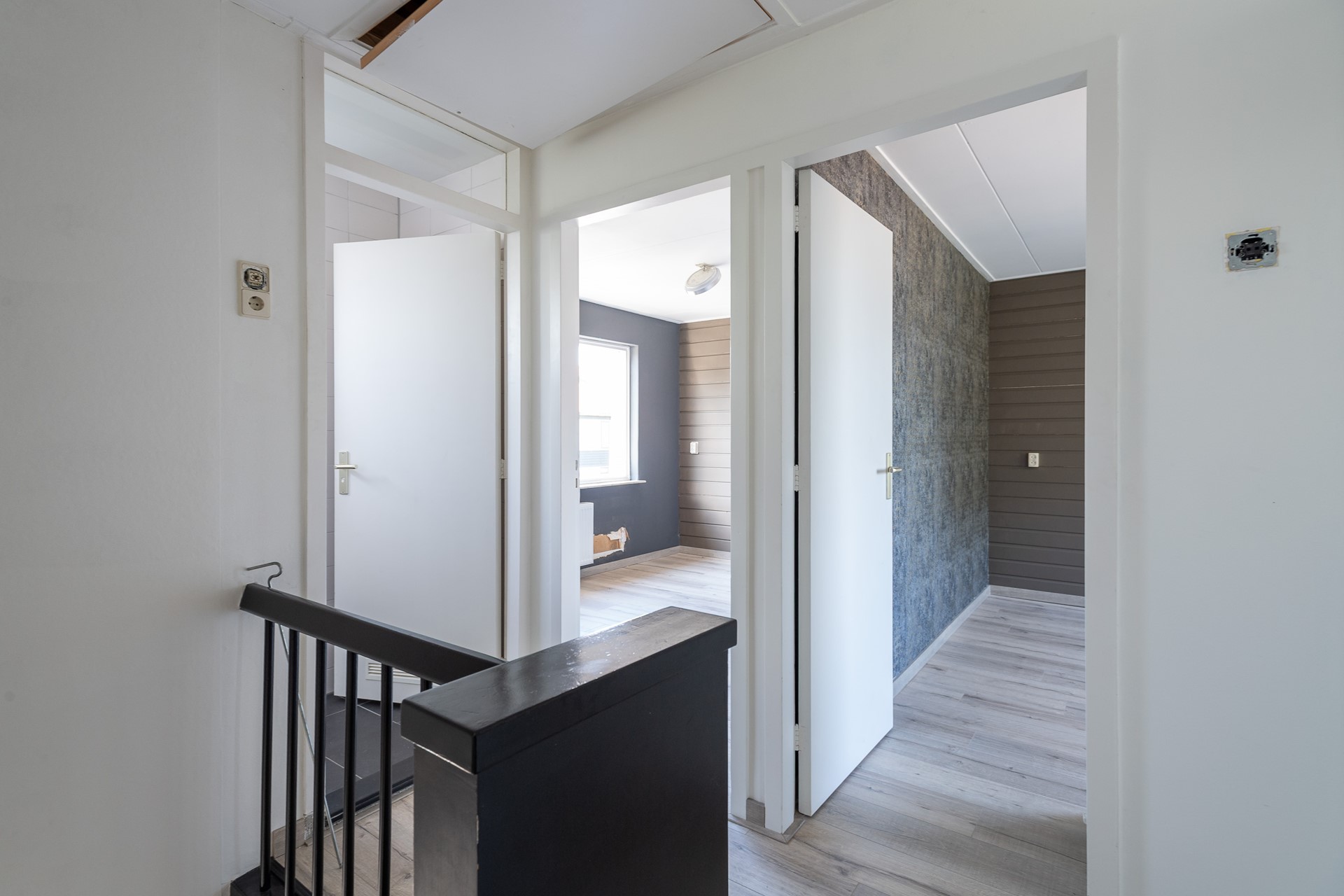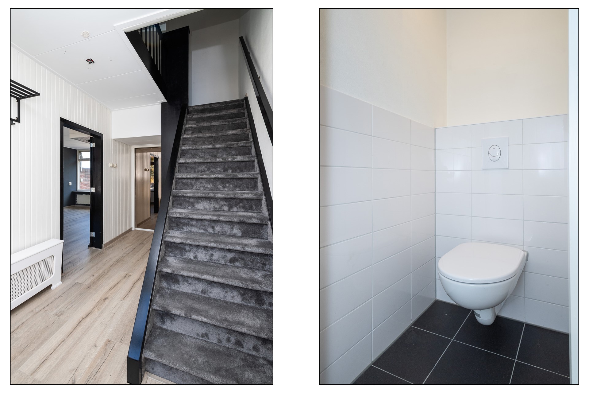 Entree, hal met trapopgang, modern hangend toilet en kelderkast. Lichte doorz... Meer informatie