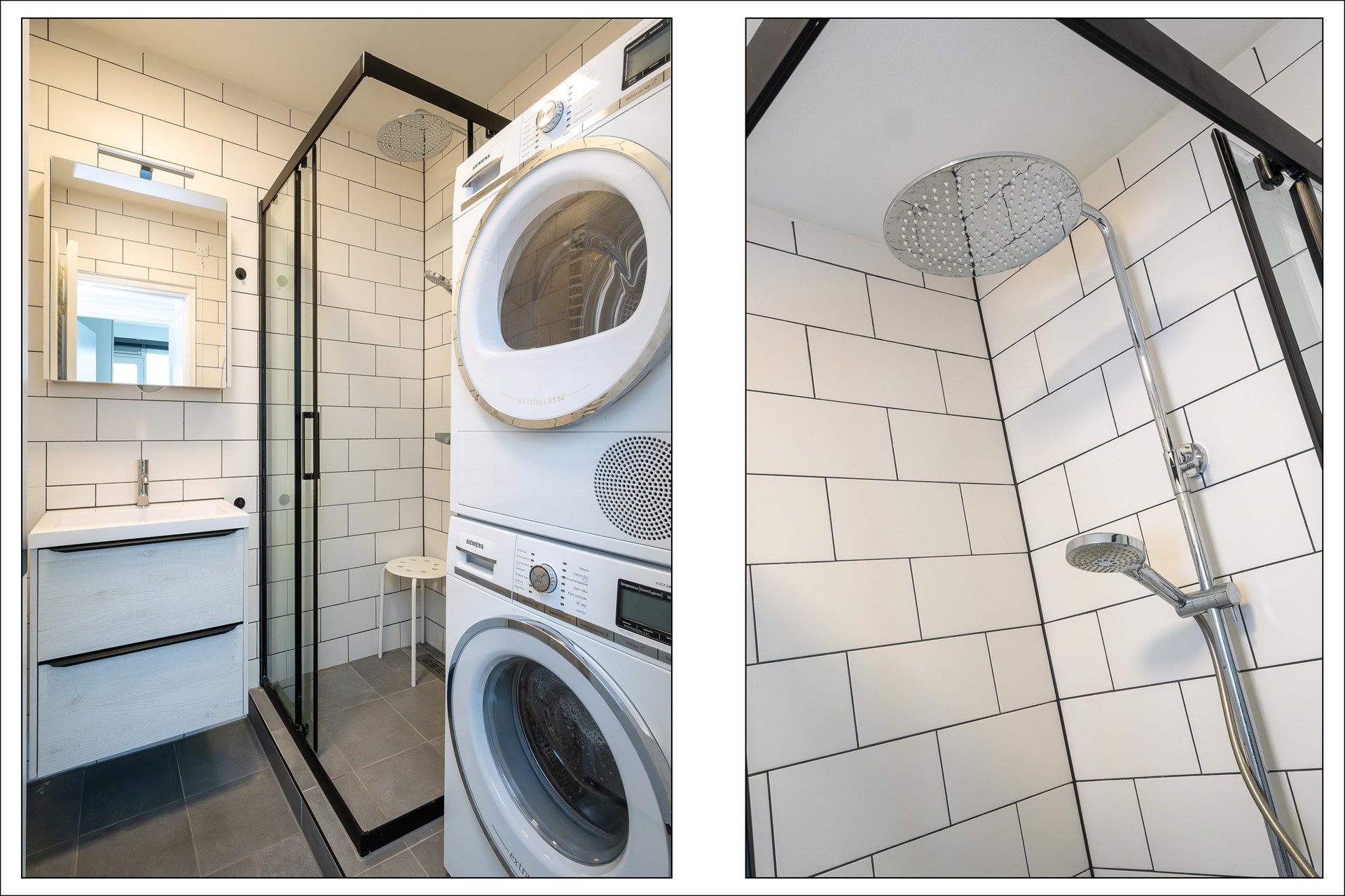 Moderne betegelde badkamer met douche en wastafelmeubel.