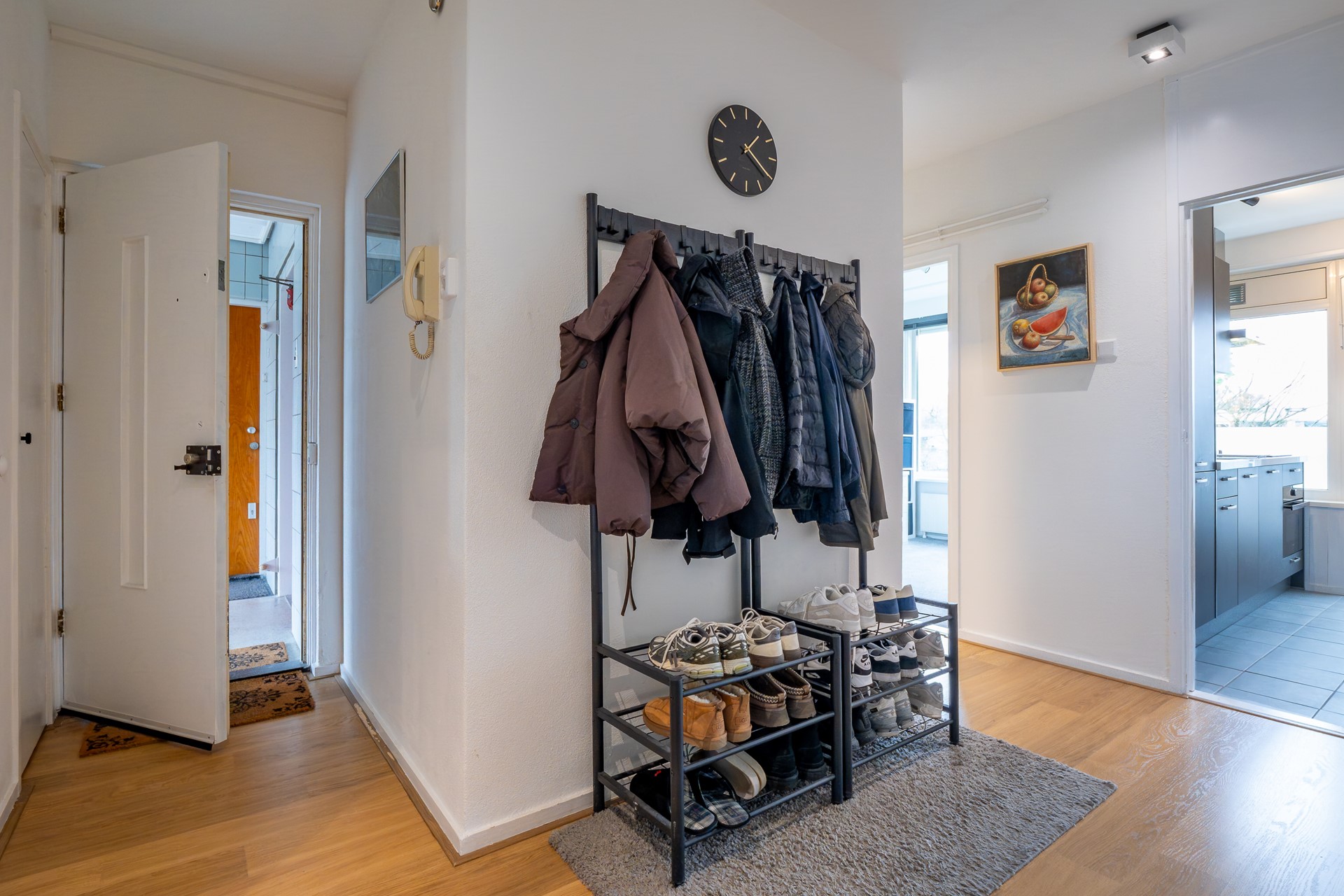 Afgesloten entree, met aan de buitenzijde de brievenbussen en het bellentableau. De entree geeft toegang tot de lift, het trappenhuis en de bergingen. Het appartement beschikt over een eigen berging.