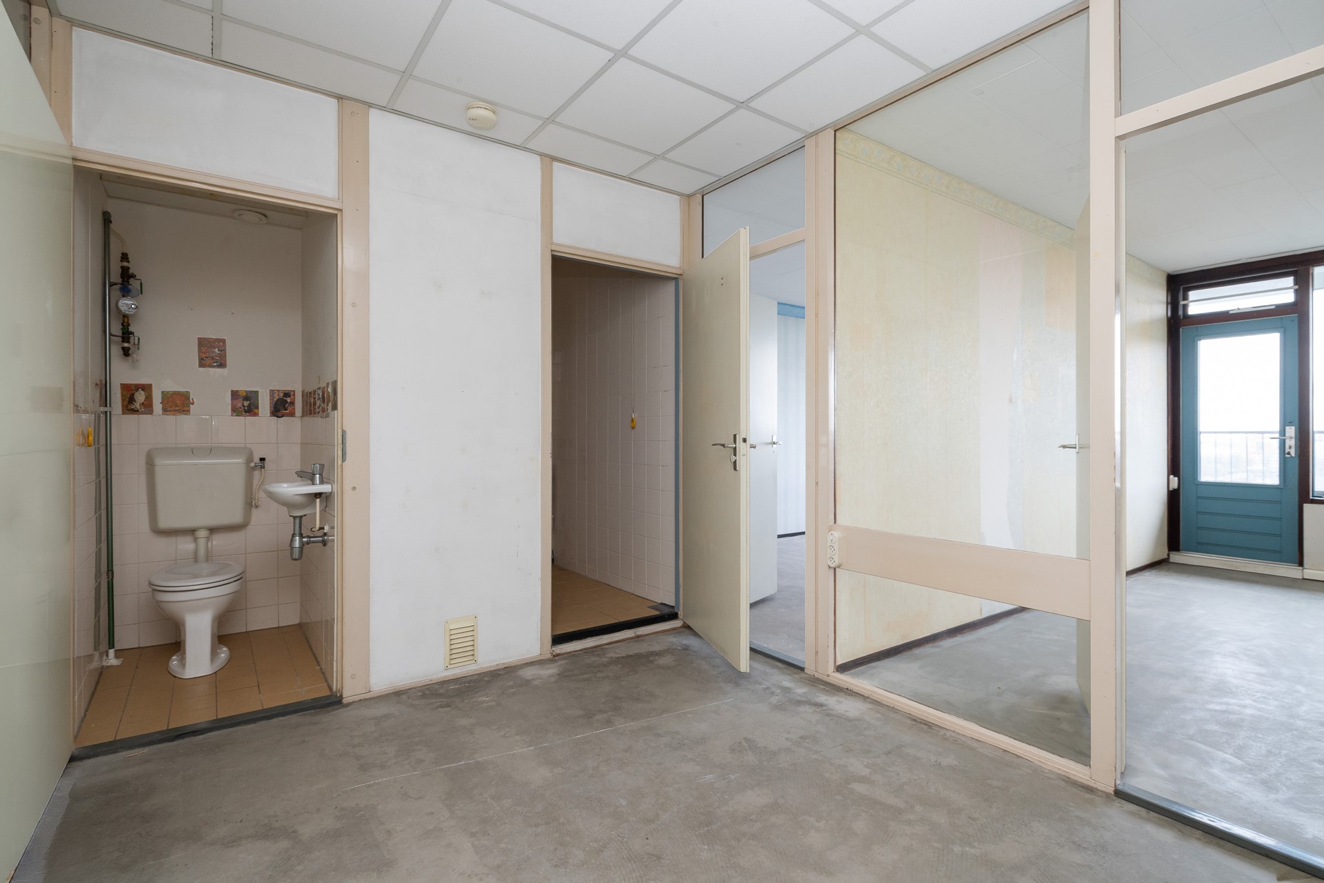 Galerij met toegang tot woning, keukenblok aan voorzijde voorzien van een Daalderop elektrische boiler, meterkast, separate toiletruimte met fontein, licht betegelde badkamer met douchehoek, wastafel en wasmachineaansluiting, ruime inpandige berging, twee slaapkamers aan de voorzijde, woonkamer en slaapkamer aan de achterzijde. Vanuit de woonkamer een deur naar het woning brede balkon met ligging op het zonnige zuiden en mooi uitzicht richting de stad.