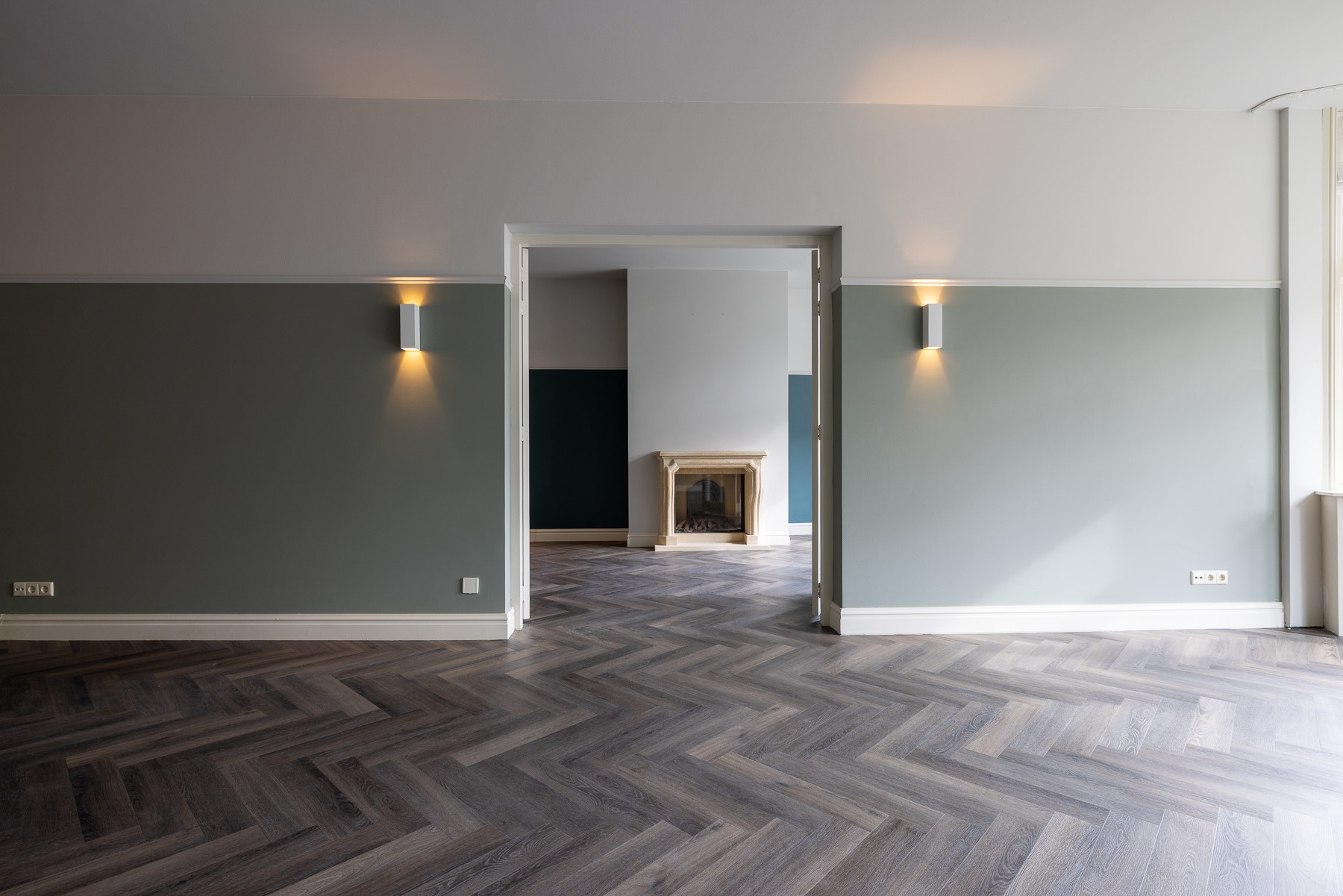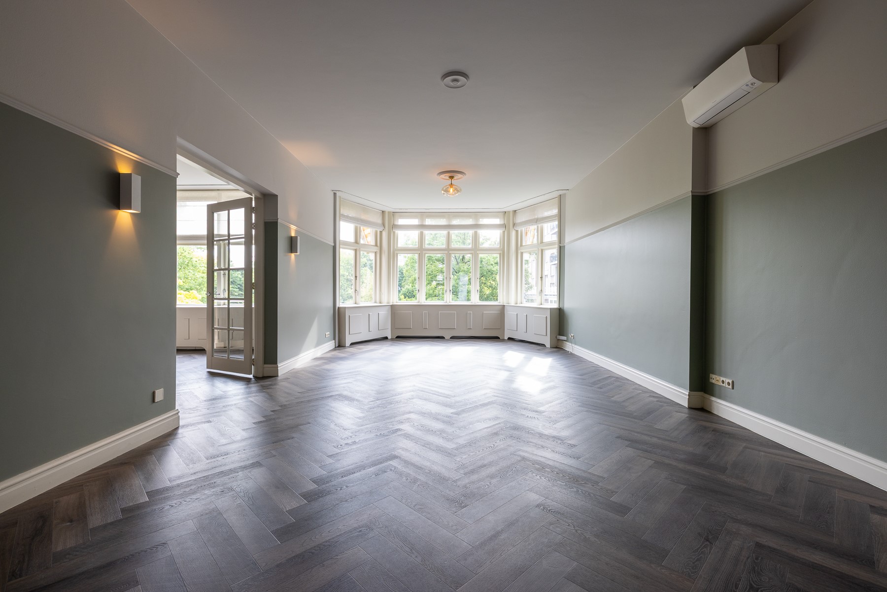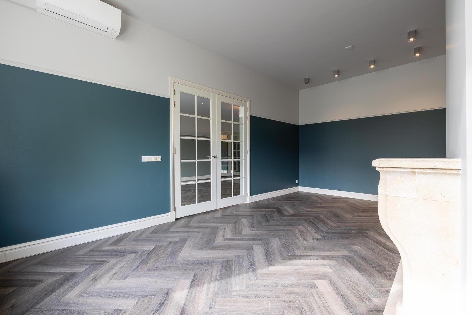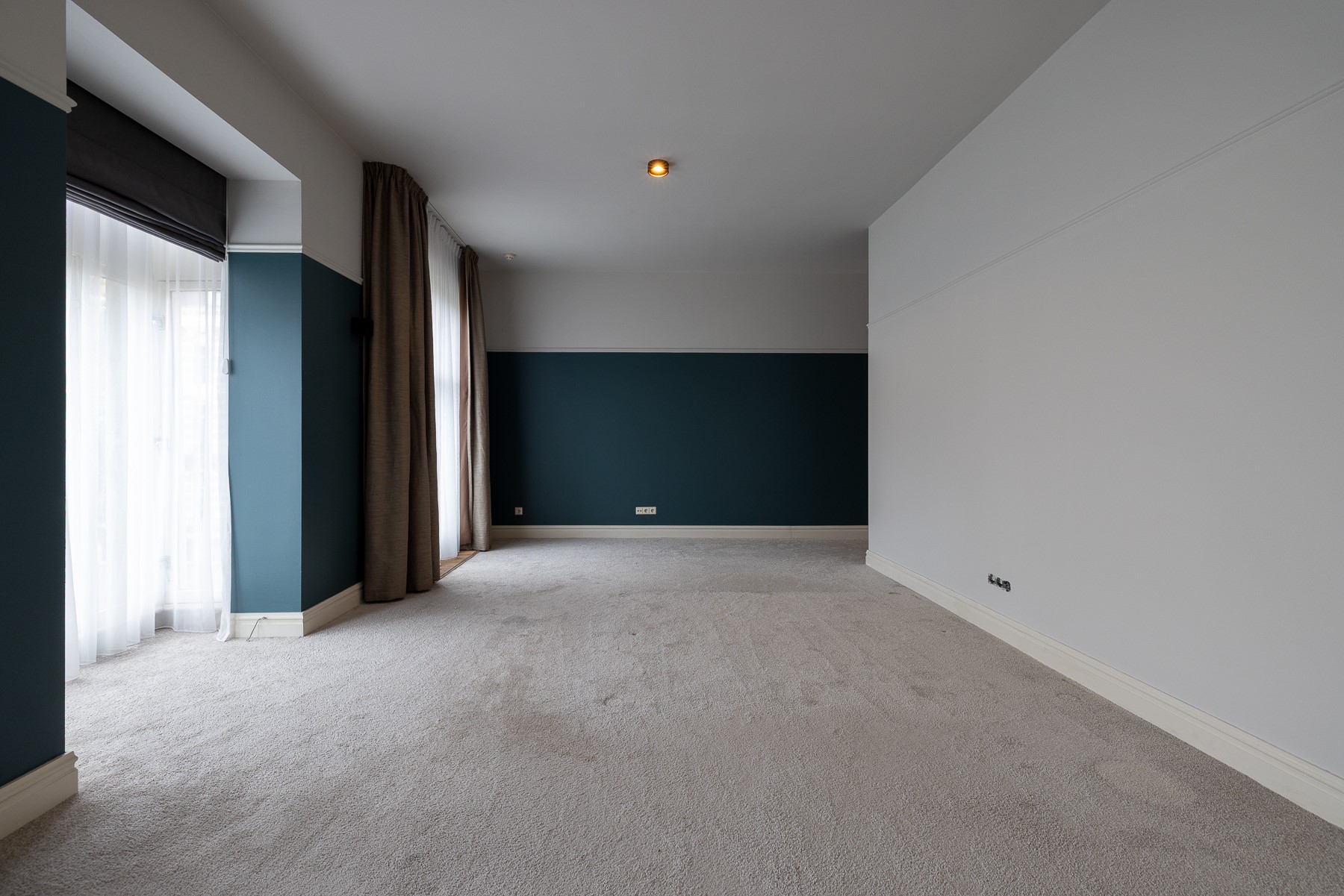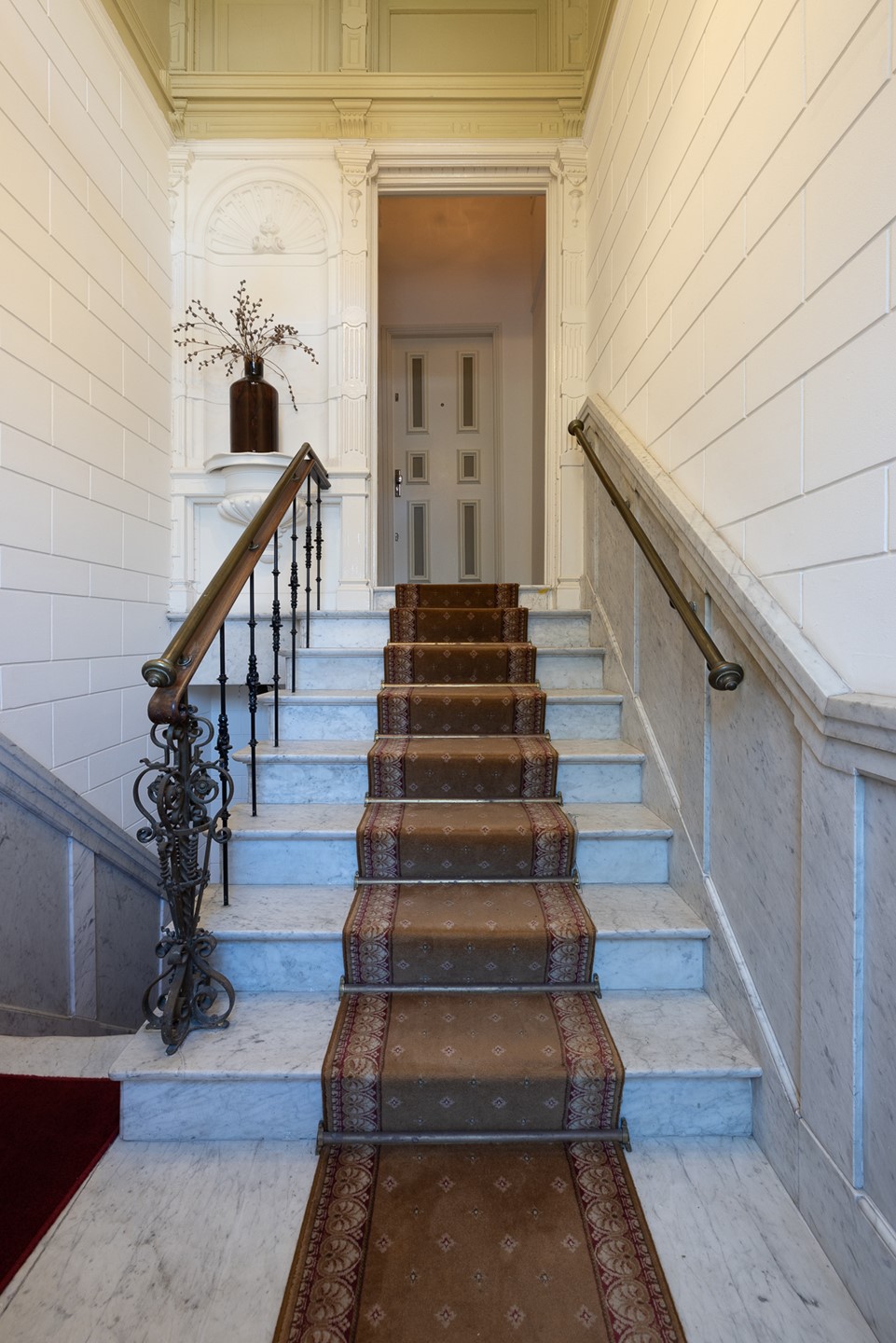 Entree, hal, toilet met fontein, wasruimte met cv-opstelling, hal, slaapkamer met openslaande deuren naar zonnig terras. Aangrenzende luxe badkamer. Hoofdslaapkamer met aangrenzende luxe badkamer, enorme woonkamer met dubbele deuren naar aangrenzende tv-kamer of 3e slaapkamer met open haard. Imposante woonkeuken met 2e open haard, toegang naar 2e balkon en luxe nieuwe keukenopstelling voorzien van alle denkbare apparatuur zoals stoomoven en aparte grote wijnkast. Aparte logeer- of werkkamer met toegang tot aparte entree middels trappenhuis.