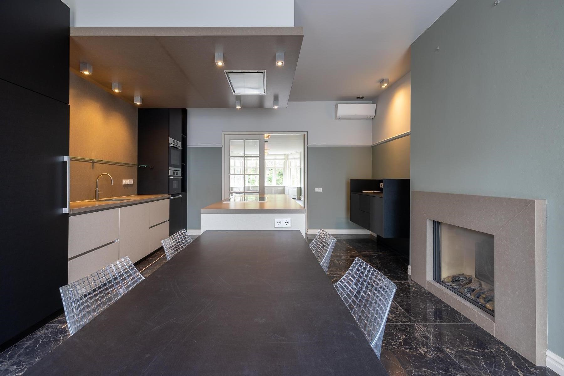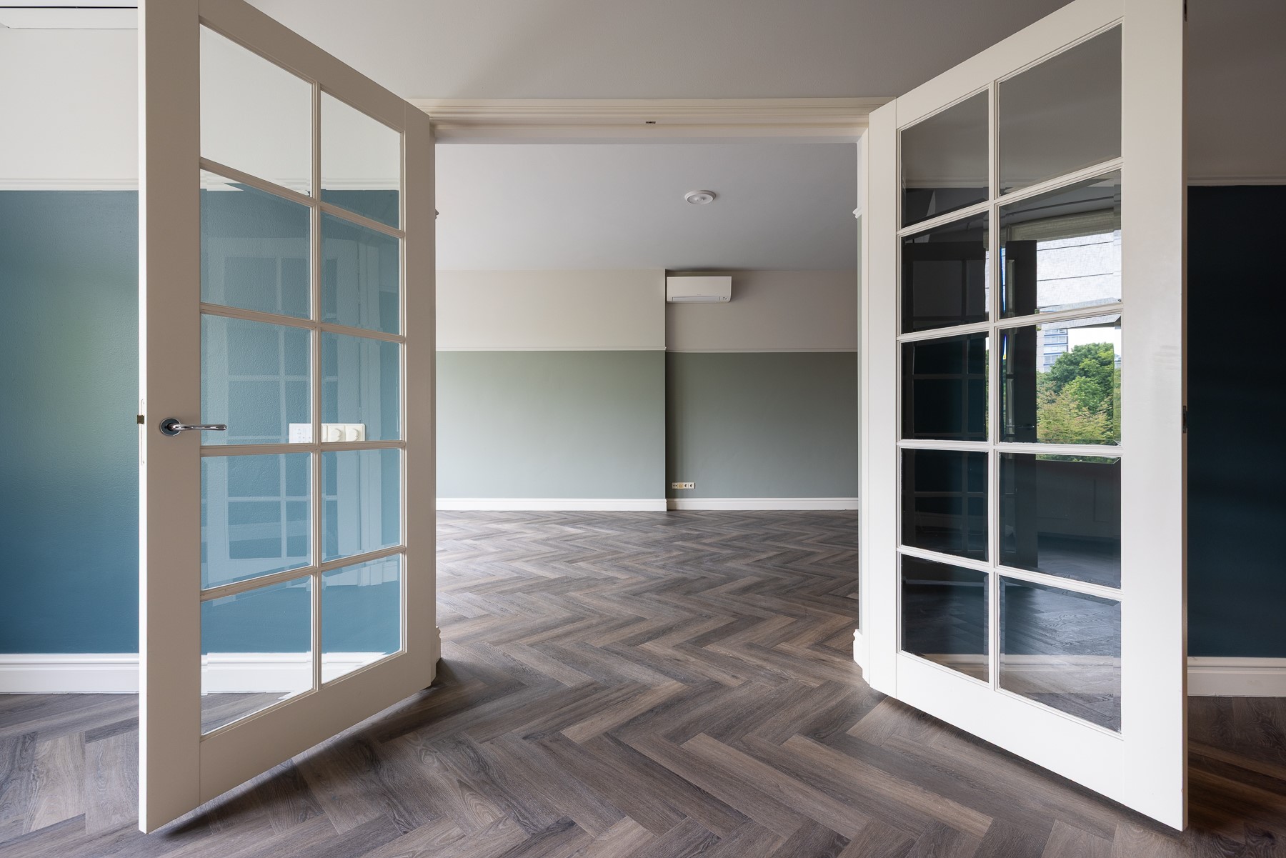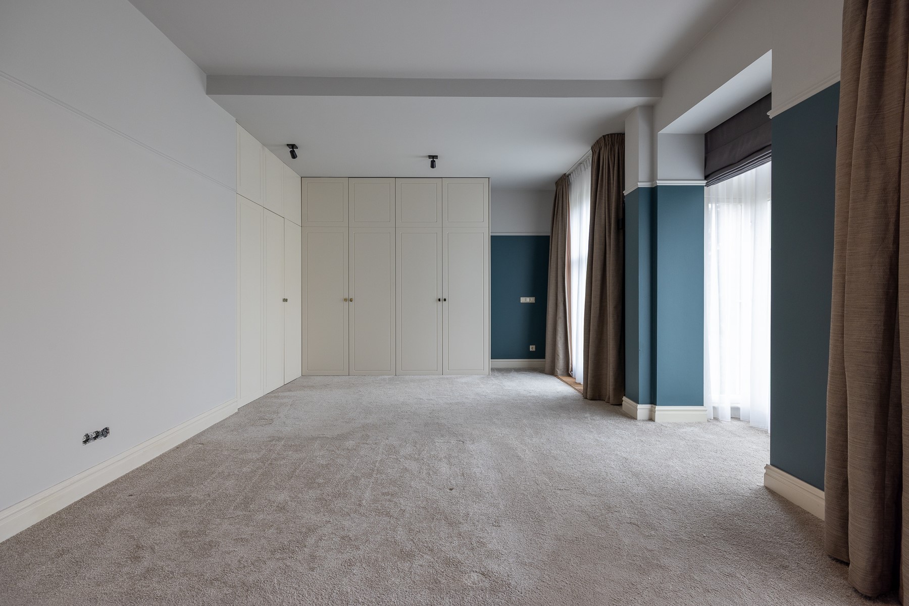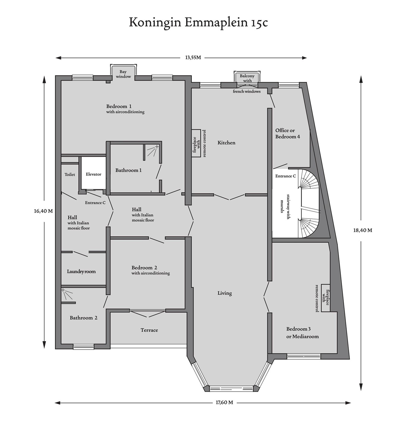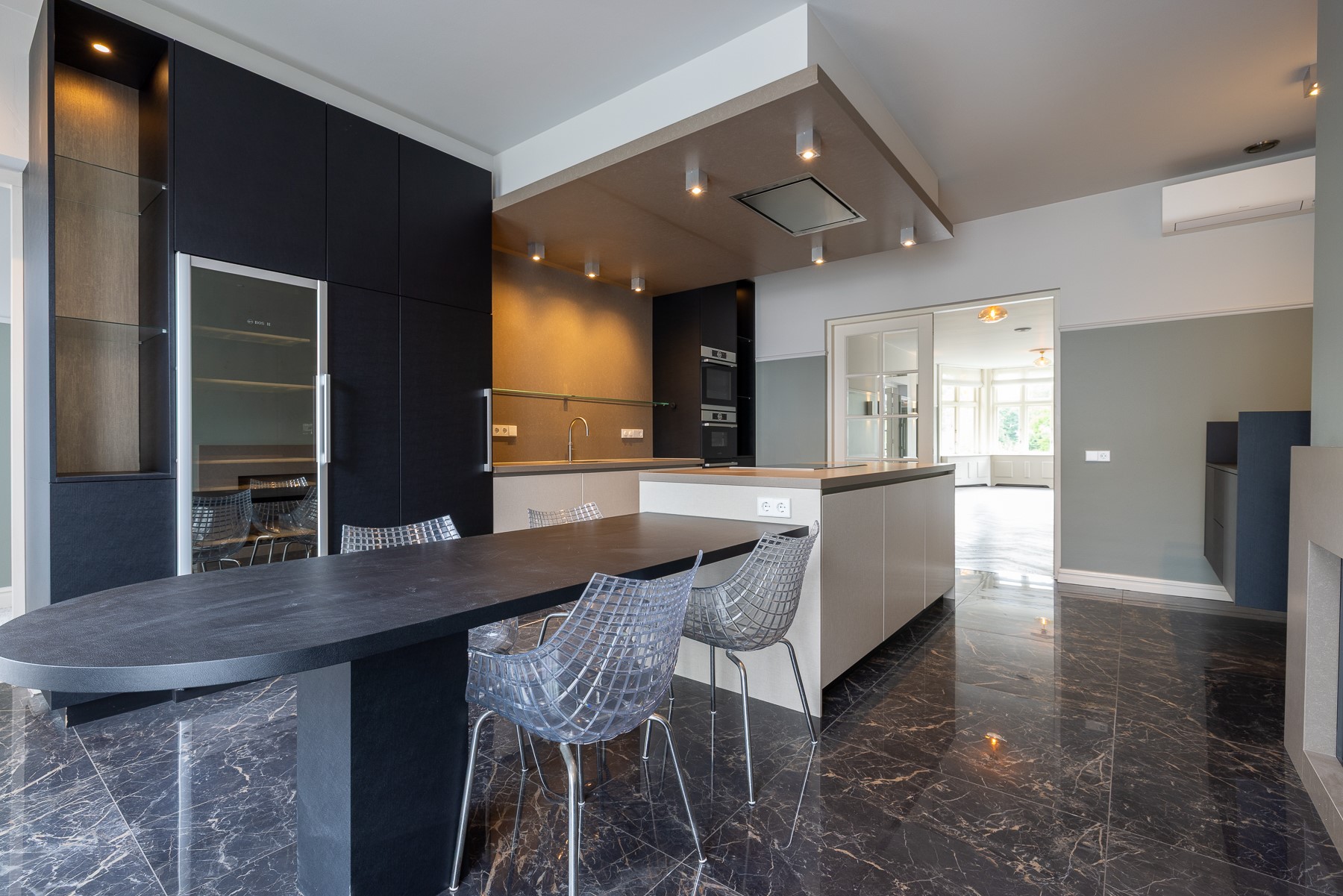 Entree, hal, toilet met fontein, wasruimte met cv-opstelling, hal, slaapkamer met openslaande deuren naar zonnig terras. Aangrenzende luxe badkamer. Hoofdslaapkamer met aangrenzende luxe badkamer, enorme woonkamer met dubbele deuren naar aangrenzende tv-kamer of 3e slaapkamer met open haard. Imposante woonkeuken met 2e open haard, toegang naar 2e balkon en luxe nieuwe keukenopstelling voorzien van alle denkbare apparatuur zoals stoomoven en aparte grote wijnkast. Aparte logeer- of werkkamer met toegang tot aparte entree middels trappenhuis.