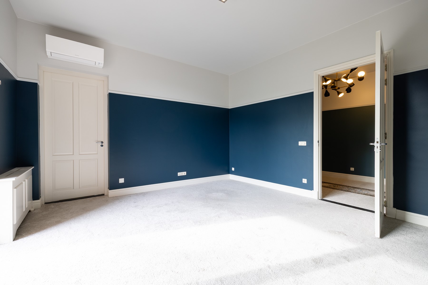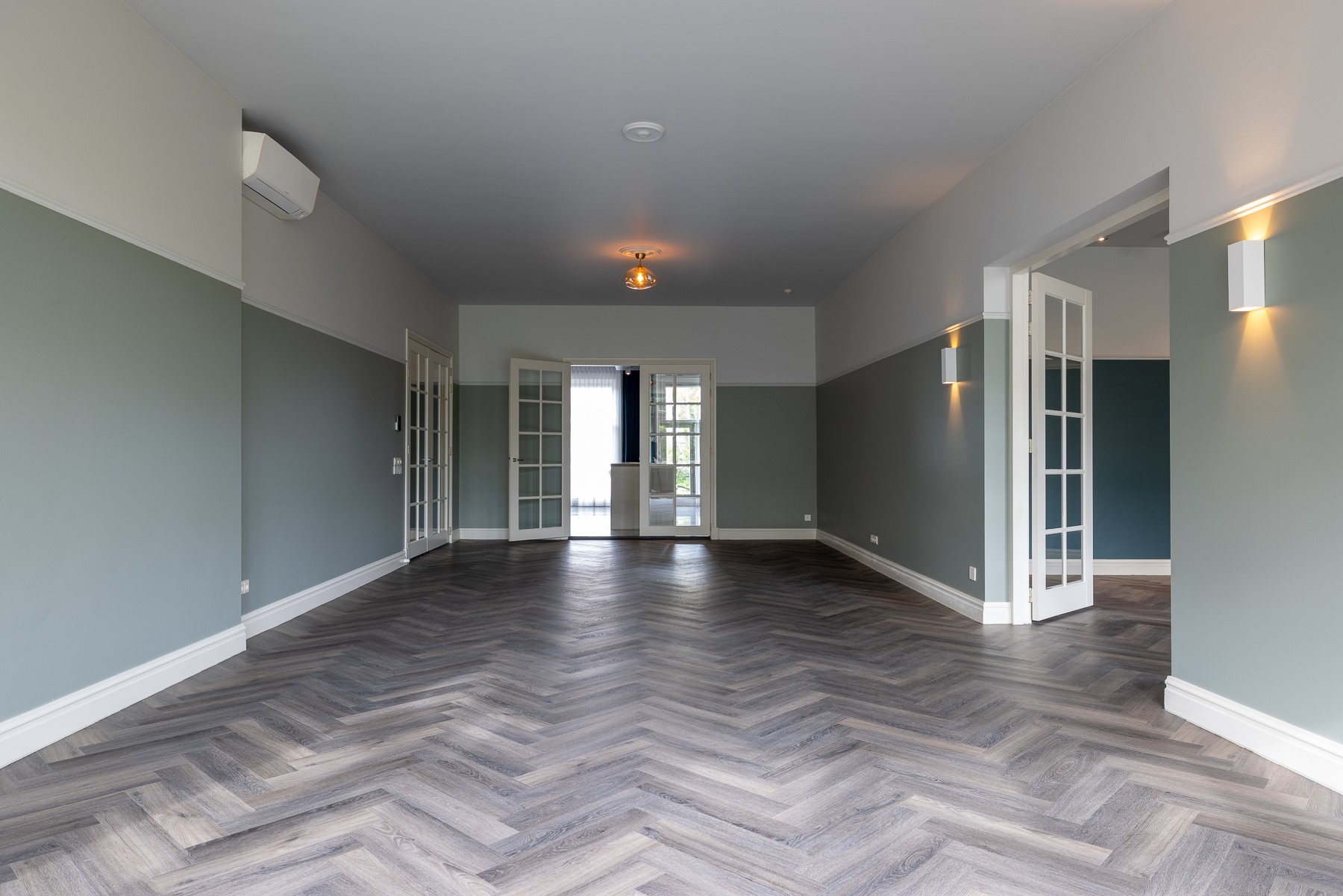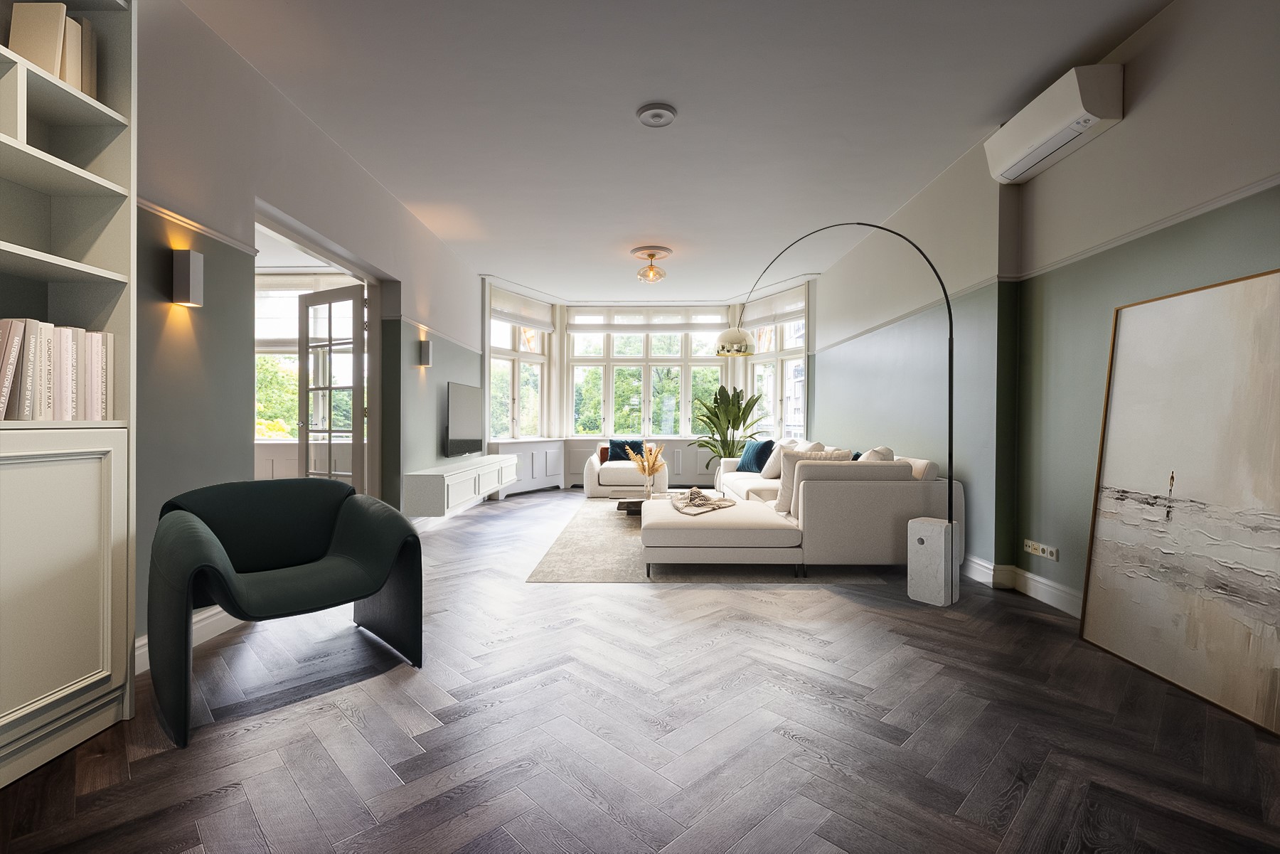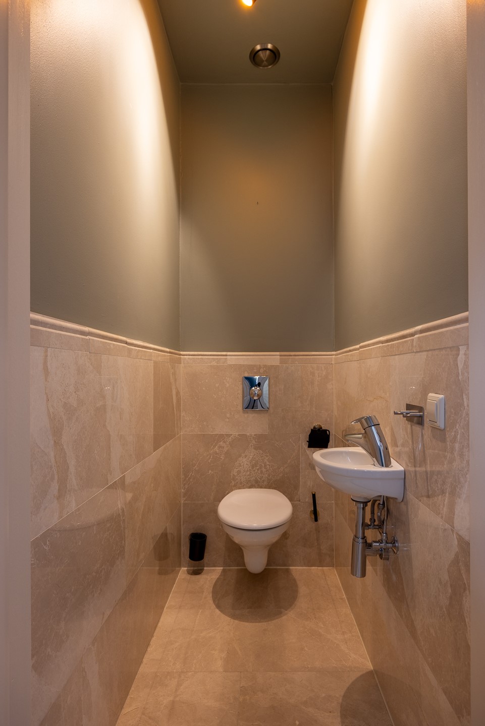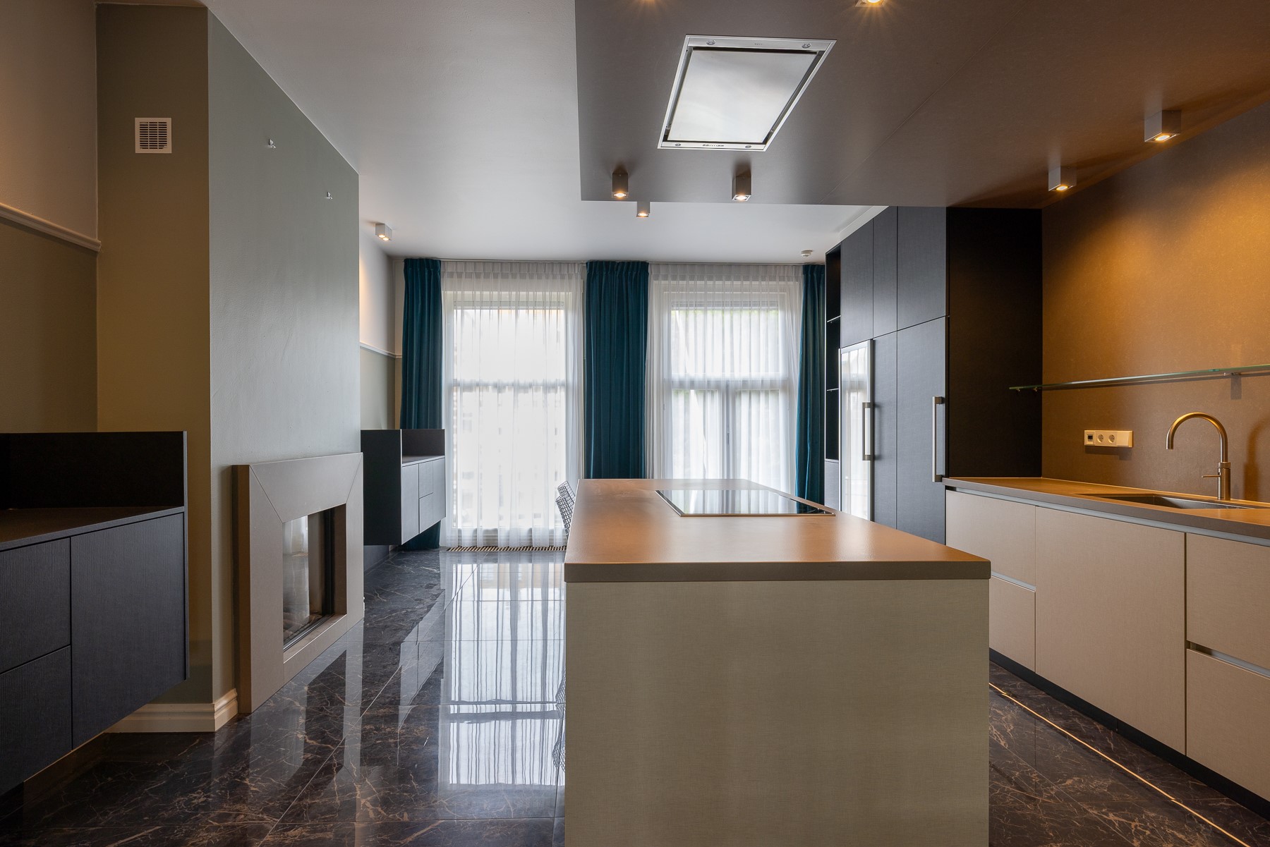 Entree, hal, toilet met fontein, wasruimte met cv-opstelling, hal, slaapkamer met openslaande deuren naar zonnig terras. Aangrenzende luxe badkamer. Hoofdslaapkamer met aangrenzende luxe badkamer, enorme woonkamer met dubbele deuren naar aangrenzende tv-kamer of 3e slaapkamer met open haard. Imposante woonkeuken met 2e open haard, toegang naar 2e balkon en luxe nieuwe keukenopstelling voorzien van alle denkbare apparatuur zoals stoomoven en aparte grote wijnkast. Aparte logeer- of werkkamer met toegang tot aparte entree middels trappenhuis.