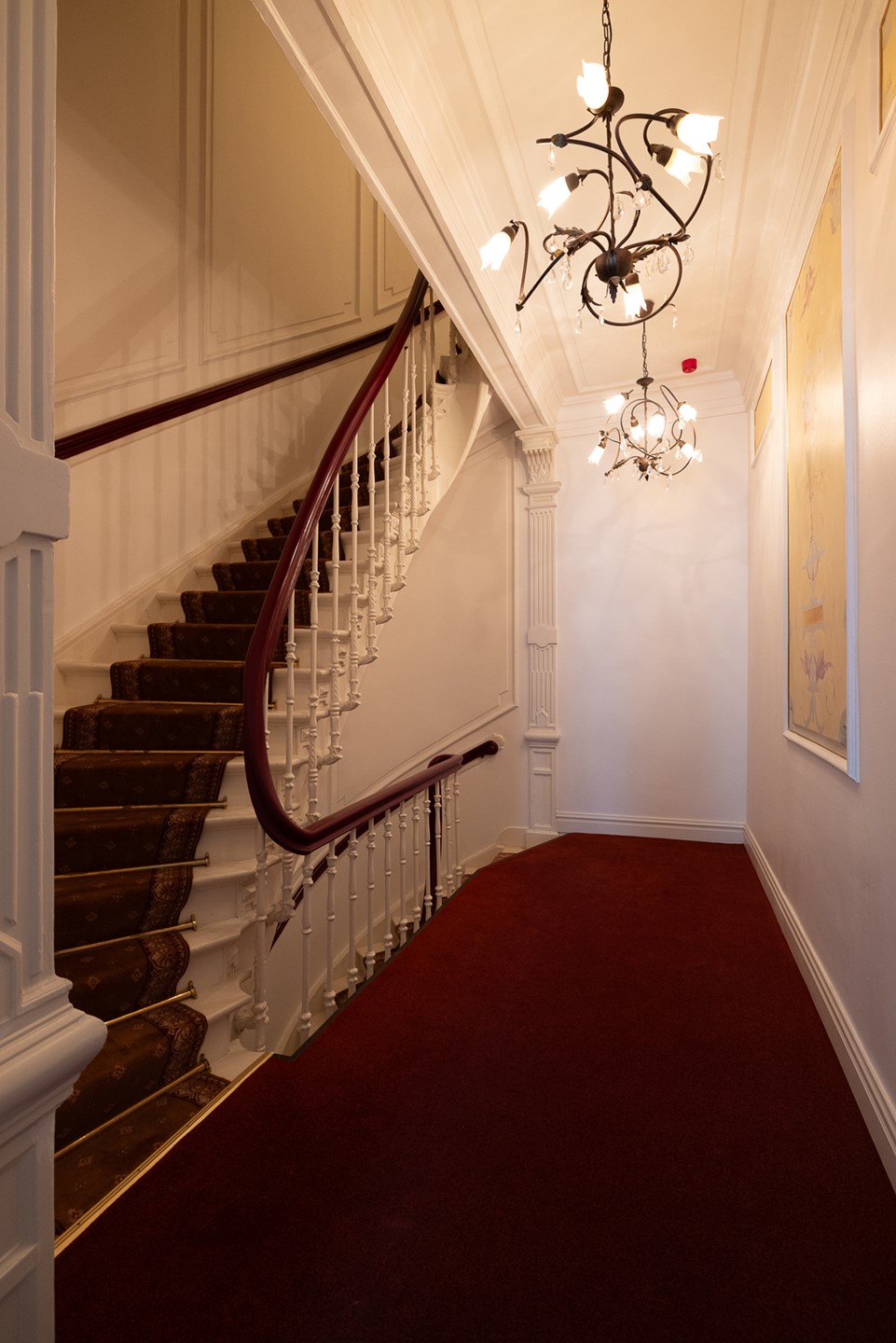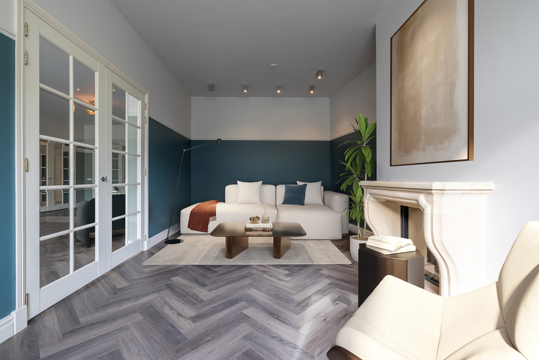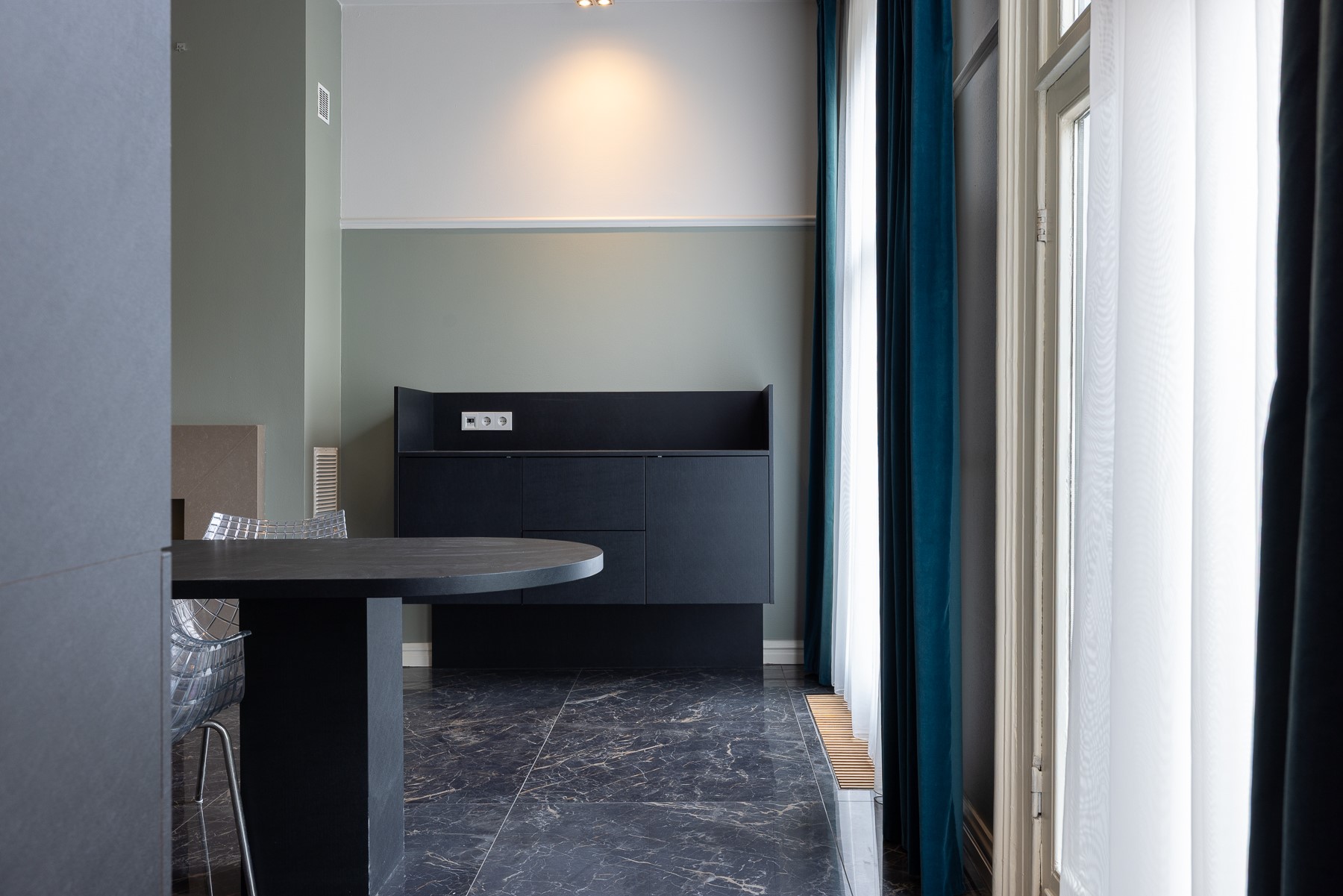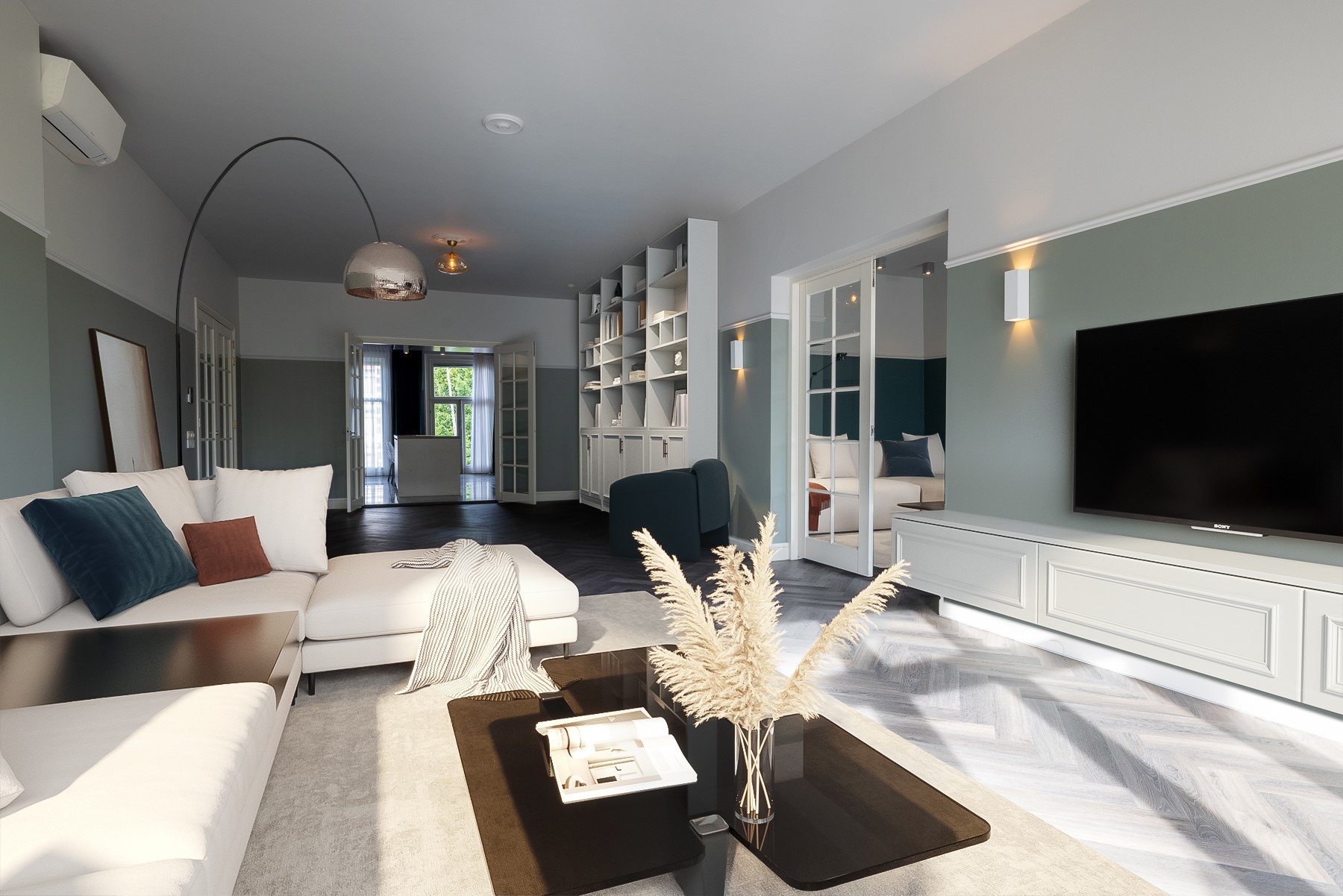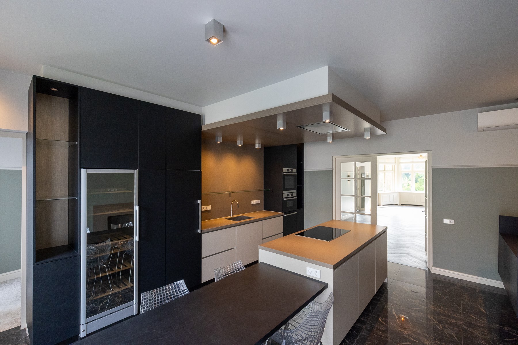 Entree, hal, toilet met fontein, wasruimte met cv-opstelling, hal, slaapkamer met openslaande deuren naar zonnig terras. Aangrenzende luxe badkamer. Hoofdslaapkamer met aangrenzende luxe badkamer, enorme woonkamer met dubbele deuren naar aangrenzende tv-kamer of 3e slaapkamer met open haard. Imposante woonkeuken met 2e open haard, toegang naar 2e balkon en luxe nieuwe keukenopstelling voorzien van alle denkbare apparatuur zoals stoomoven en aparte grote wijnkast. Aparte logeer- of werkkamer met toegang tot aparte entree middels trappenhuis.